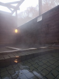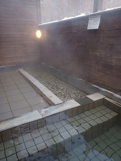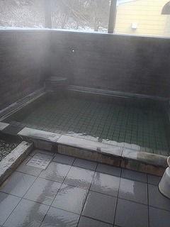 露天風呂は、オーバーフローしたお湯が浅めの砂利敷きの場所へ流れていく仕組みで、もしかして歩行浴槽?と思える造りになっている。外気温が低かったためにこの露天風呂のお湯と冷気がたまらなく心地よい。しばらくこの露天風呂でまったりしてしまった。